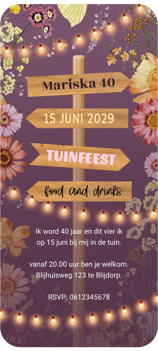 Ben je op zoek naar een unieke en feestelijke digitale uitnodiging voor een 40e verjaardag? Deze hippe en vrolijke uitnodiging voor een tuinfeest is daar perfect voor! De paarse achtergrond met bloemen, een lampjesslinger en wegwijzer zorgen voor een sfeervolle uitnodiging.