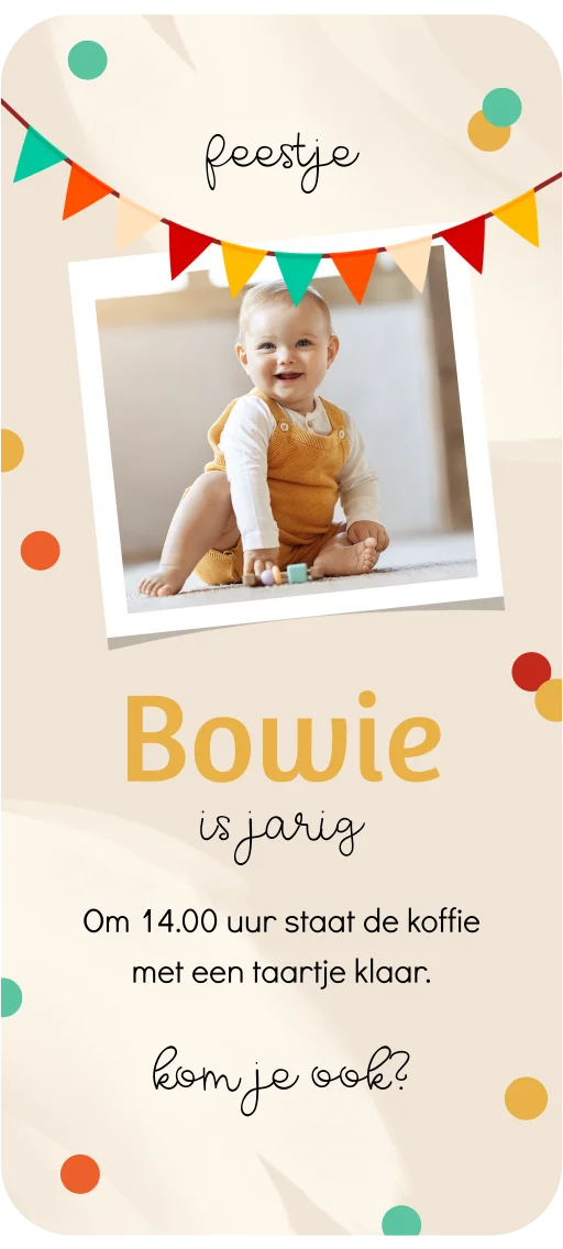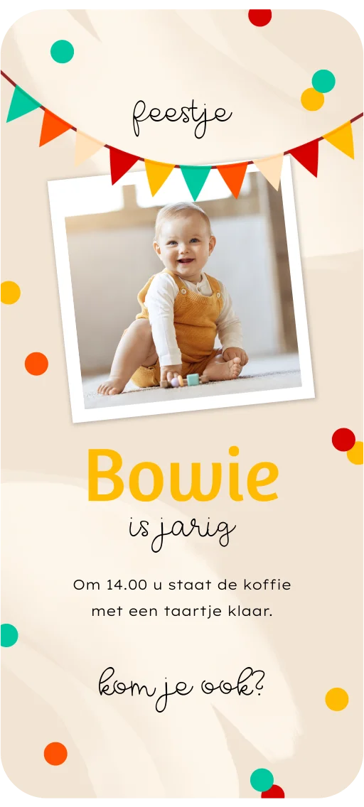 Feestelijke digitale uitnodiging voor een kinderverjaardag. Een leuke digitale uitnodiging voor een eerste verjaardag van je zoon of dochter. Op deze digitale uitnodiging zie je een beige achtergrond met kleurrijke confetti en een vlaggenslinger. Voeg een leuke foto toe van je kleine om de uitnodiging nog wat persoonlijker te maken.