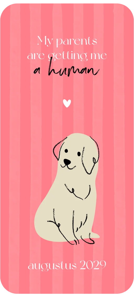 Leuke en originele digitale zwangerschapsaankondiging met de tekst 'my parents are getting me a human' met een illustratie van een hond. De achtergrond heeft een roze streeppatroon.