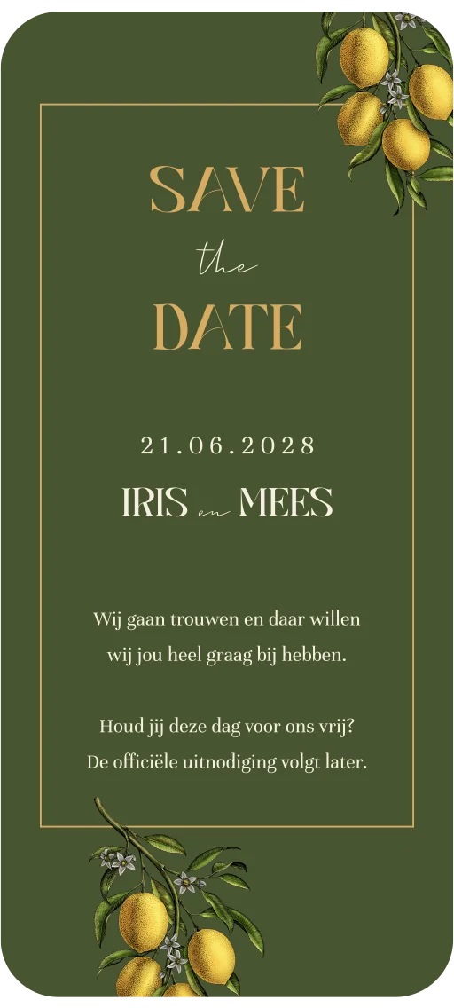 Bijzondere Save the Date kaart die je digitaal kunt versturen. Deze digitale Save the Date kaart heeft een mooie mediteraanse stijl met groene achtergrond en citroenen.