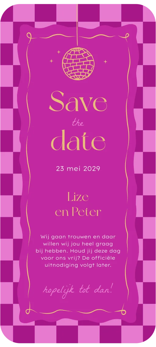 Een vrolijke digitale Save the Date kaart met een blokpatroon en discobal. Een kleurrijke digitale kaart om alvast je gasten in stijl uit te nodigen voor jullie bijzondere dag.| Totaalprijs: 0 |