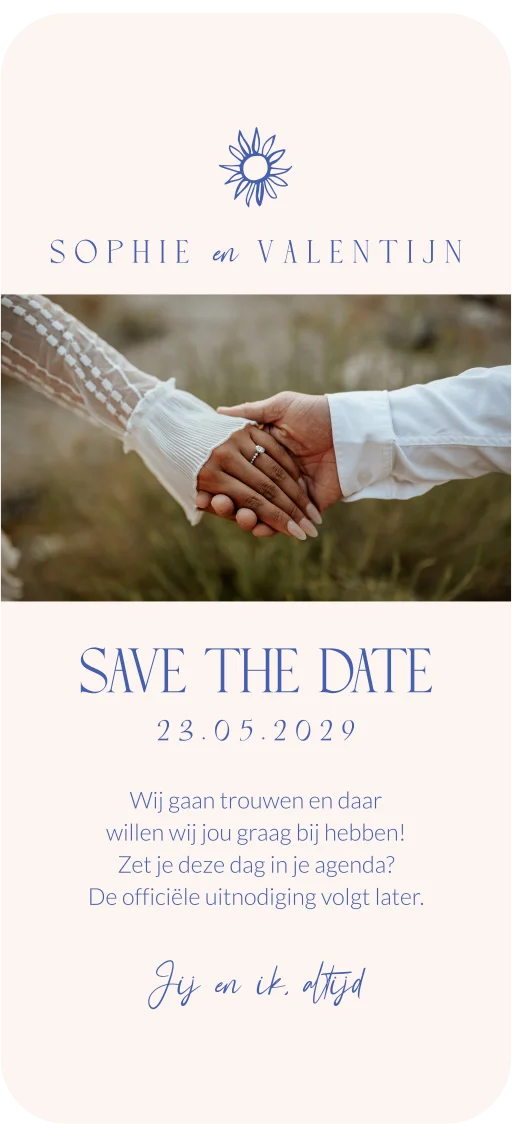 Digitale Save the Date kaart met een zon en de tekst 'Jij en ik, altijd'. Deze Save the Date uitnodiging is eenvoudig digitaal te versturen. Voeg een mooie eigen foto toe om de digitale kaart een extra persoonlijk tintje te geven.