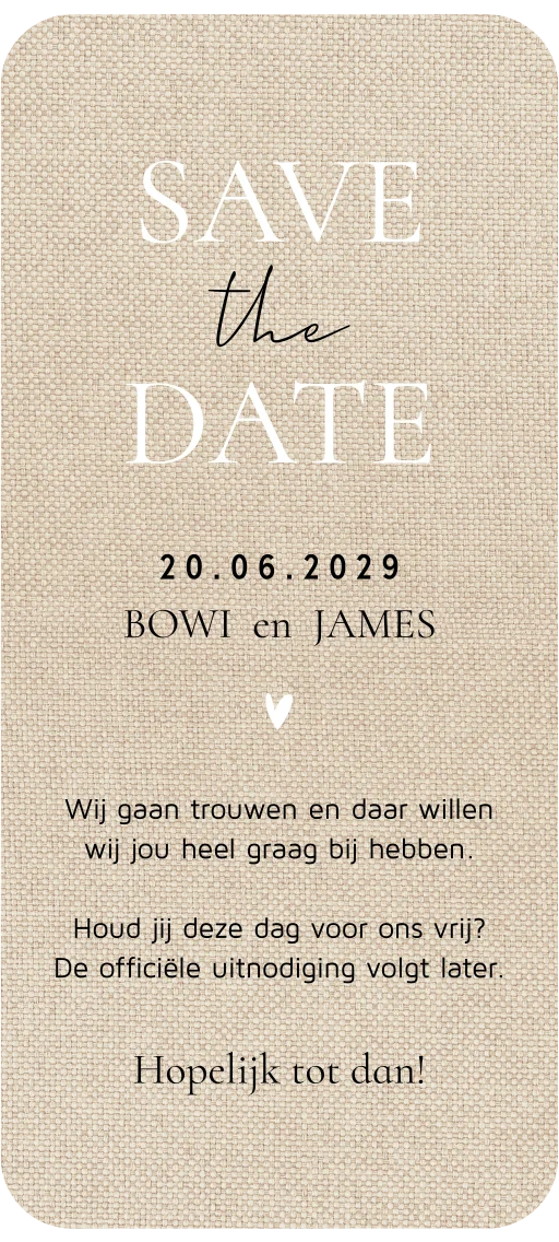 Eenvoudige trendy Save the Date kaart in linnenlook. Deze Save the Date kaart kun je digitaal versturen, hoe handig! De digitale Save the Date kaart heeft een neutraal design in trendy beige kleuren.| Totaalprijs: 0 |