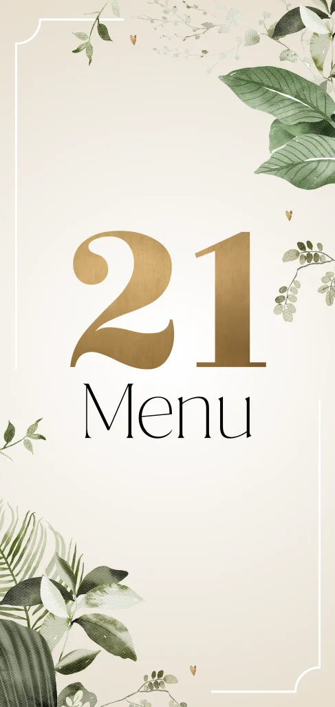 Botanische menukaart voor een 21 diner met een beige achtergrond en botanische bladeren. Pimp je 21 diner tafel met deze menukaart in de stijl van de uitnodiging. Pas de teksten, kleuren en afbeeldingen makkelijk zelf aan.| Totaalprijs: 0 |
