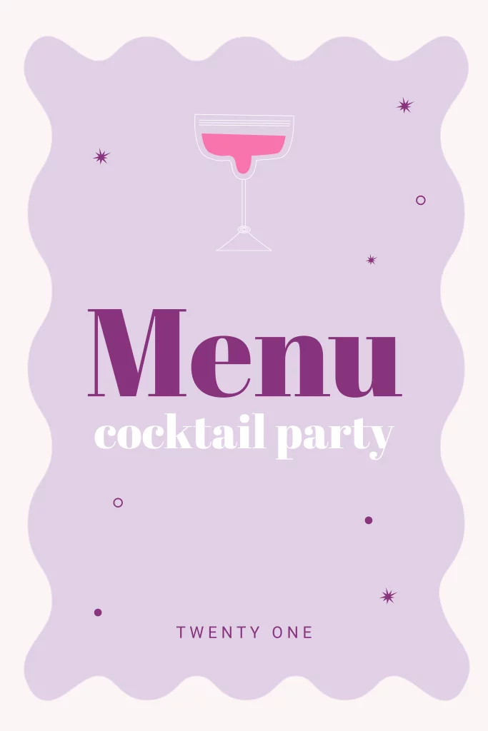 Lila menukaart met golvende vorm. Op deze menukaart staat een cocktailglas, waardoor deze menukaart goed bij een cocktailparty past. Pas de lettertypes, afbeeldingen en kleuren makkelijk zelf aan. Superleuk om samen met de bijpassende 21diner uitnodiging en naamkaartjes te bestellen!