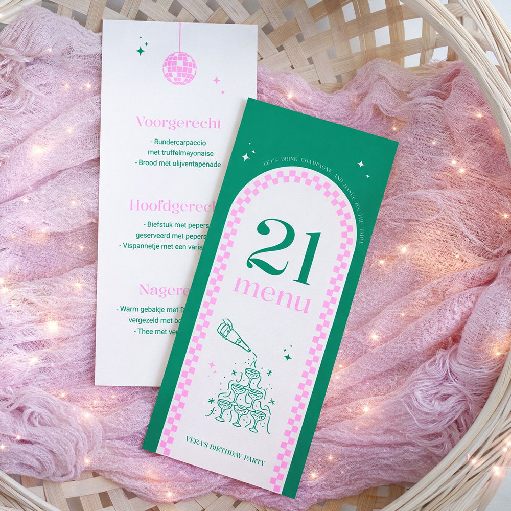 Menukaart met felle kleuren in groen en roze. Op deze menukaart staat een champagne toren welke gevuld wordt met een champagnefles. Pas de lettertypes, afbeeldingen en kleuren makkelijk zelf aan. Superleuk om samen met de bijpassende 21diner uitnodiging te bestellen!