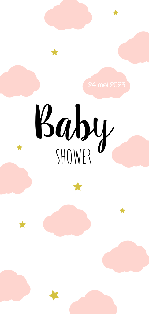 Uitnodiging voor een baby shower voor een meisje. Op deze hippe kaart staan wolkjes en sterretjes. De zachte kleur pastelroze is gecombineerd met goud geel, helemaal hip toch?! De kleuren van deze babyshower kaart zijn gemakkelijk aan te passen.
