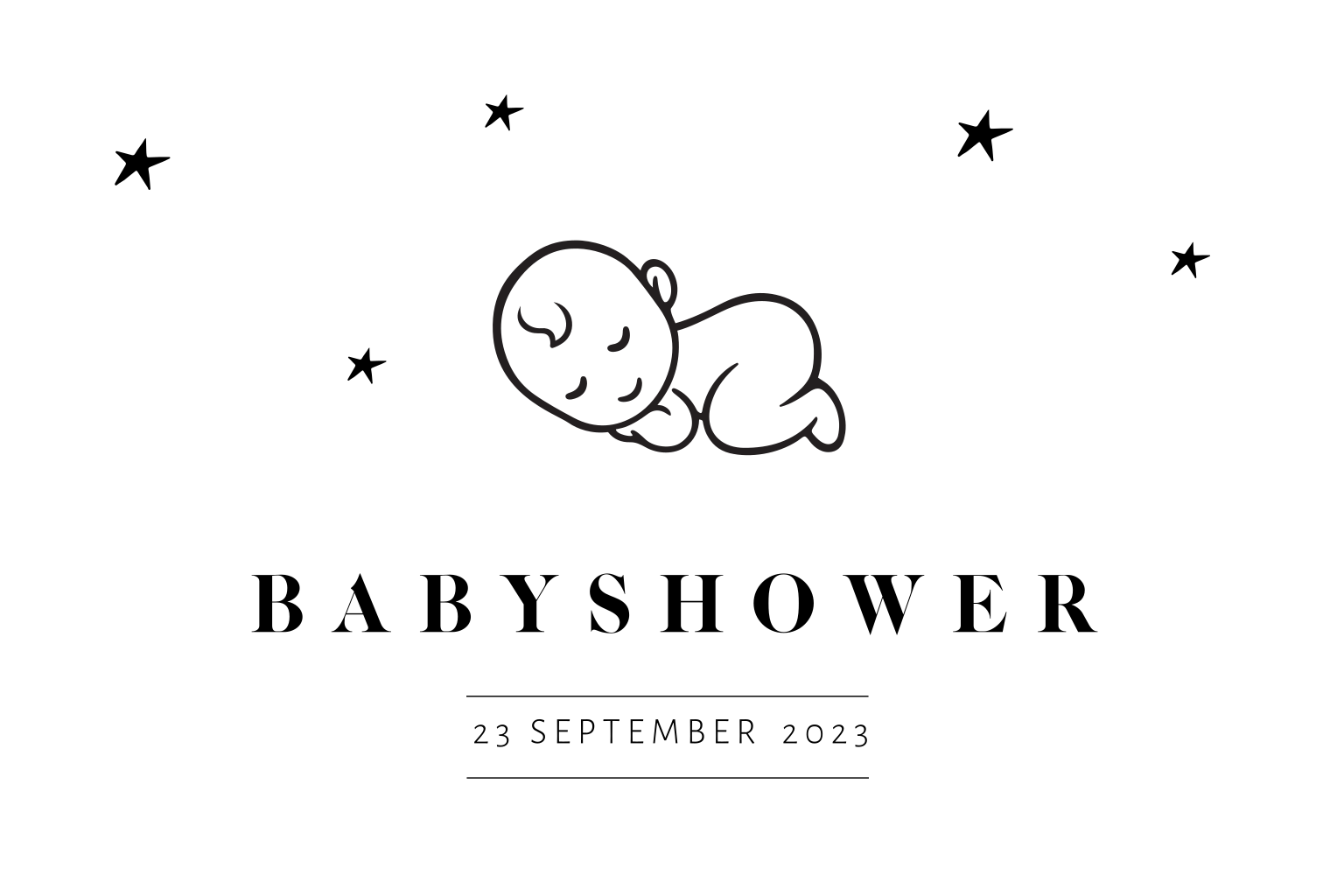 Trendy zwart wit kaartje voor een babyshower. Op dit kaartje met een rustige uitstraling staat een lijntekening van een baby gedecoreerd met enkele sterren op de achtergrond.