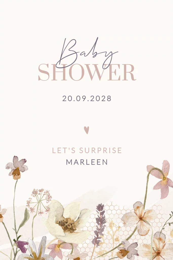 Romantische uitnodiging voor een babyshower. Deze kaart is voorzien van prachtige veldbloemen en helemaal geschikt al verassing voor iemand die een meisje verwacht. Pas de kleuren, teksten en lettertypes eenvoudig aan in de editor.