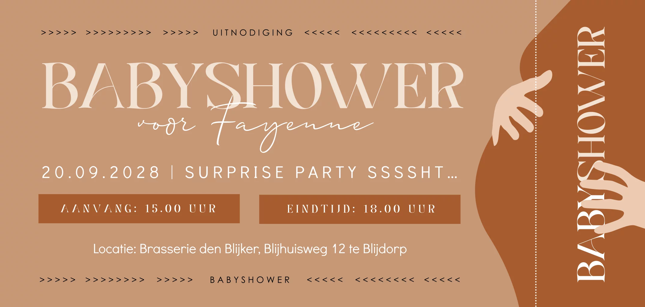 Typografische uitnodiging voor een surprise party babyshower in ticket stijl in bruine tinten. Op de ticket een illustratie van een zwangere buik. De kleuren en lettertypes kun je aanpassen in de editor. Hulp nodig? We helpen je graag.