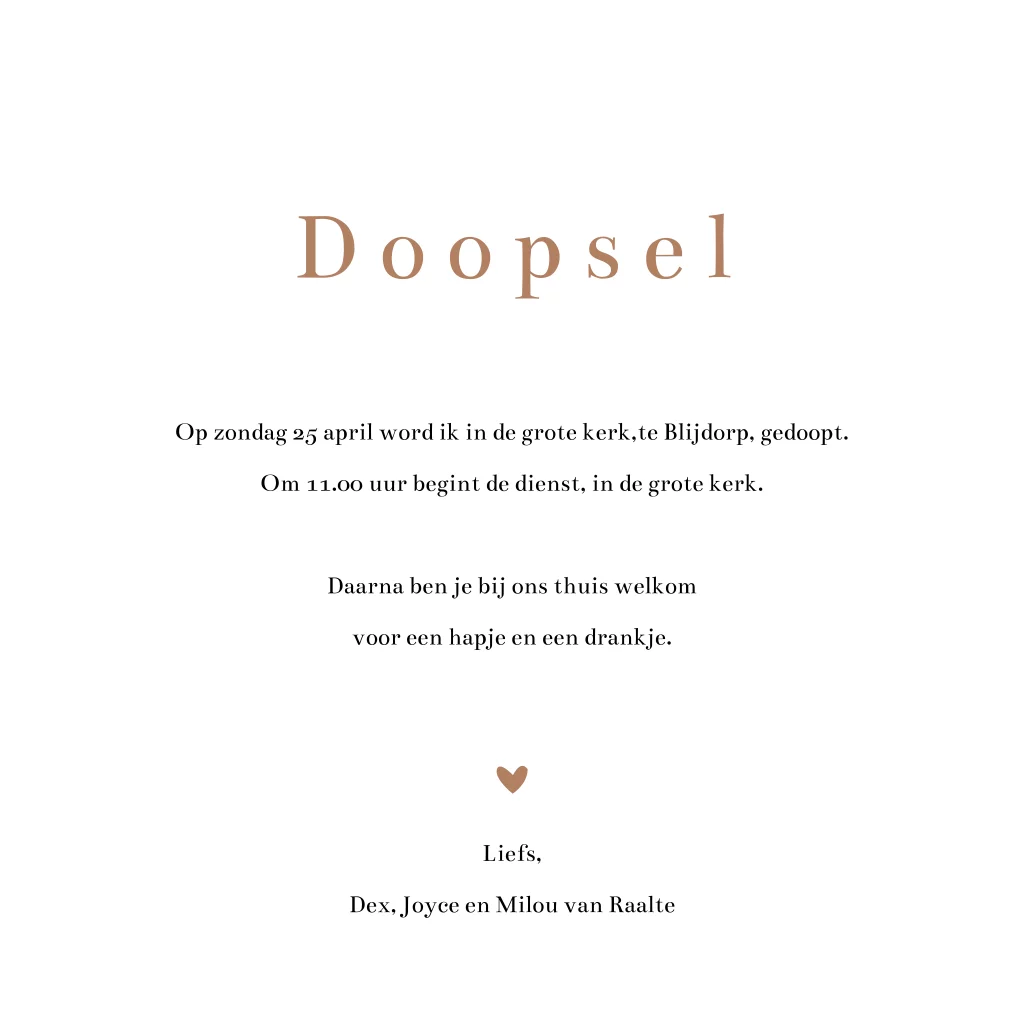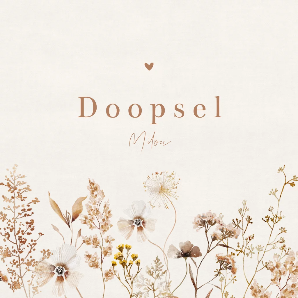 Hippe uitnodiging voor een doopsel met veldbloemen in bruintinten. Deze uitnodiging Doopsel heeft een klein hartje bovenaan het kaartje en een beige achtergrondkleur. Pas dit kaartje eenvoudig aan in de online editor.