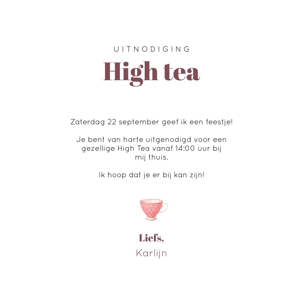 Een zoete high tea uitnodiging! Je ziet een grote roze theekop met binnenin de theepot tekst over jouw high tea. Om de theepot heen zie je allerlei zoete gebakjes en kleine theepotjes. Een gezellige roze uitnodiging voor jouw lekkere high tea! In de online editor kun je deze kaart naar eigen smaak aanpassen.