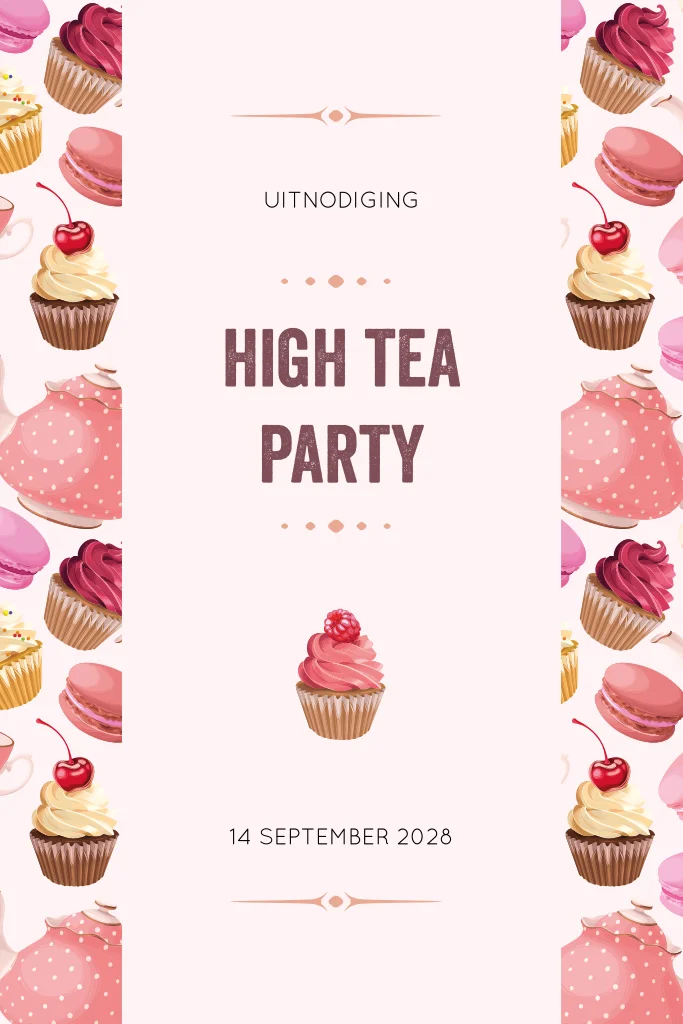 Deze high tea uitnodiging met een illustratieve leuke theepot, cupcakes en macarons is de perfecte keuze voor een gezellige high tea. In het roze kader kun je allerlei informatie kwijt over je high tea. Deze high tea uitnodiging heeft een roze kleur en ziet er daardoor zoet uit! Dit gehele kaartje kun je naar eigen wens aanpassen in de online editor.