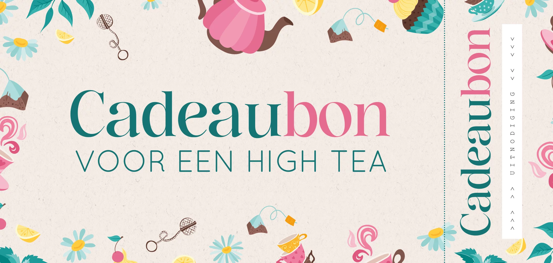 Ticket cadeaubon high tea uitnodiging met theepot, cupcakes en bloemen