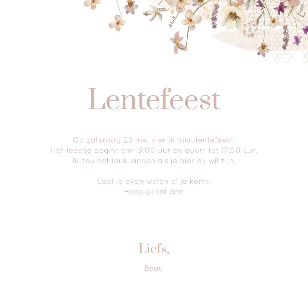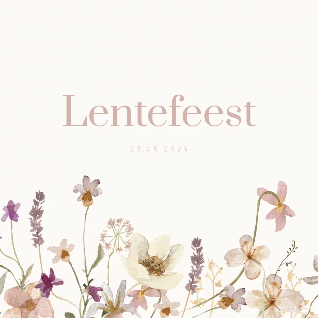 Prachtig klassieke uitnodiging voor een lentefeest met bloemen voor een meisje. Op dit kaartje staan kleurrijke aquarel bloemen in zachte roze en paarse tinten. Pas de teksten, kleuren en lettertypes naar je eigen smaak aan in de editor. Vragen? Laat het ons weten!