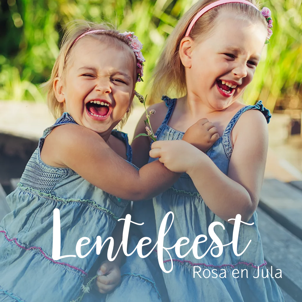 Vrolijk lentefeest uitnodiging met foliedruk en een foto van twee meisjes, een tweeling. Op dit kaartje is ruimte voor een eigen foto, welke je heel makkelijk kunt toevoegen via onze online editor. Hulp nodig? Stuur gerust een berichtje.