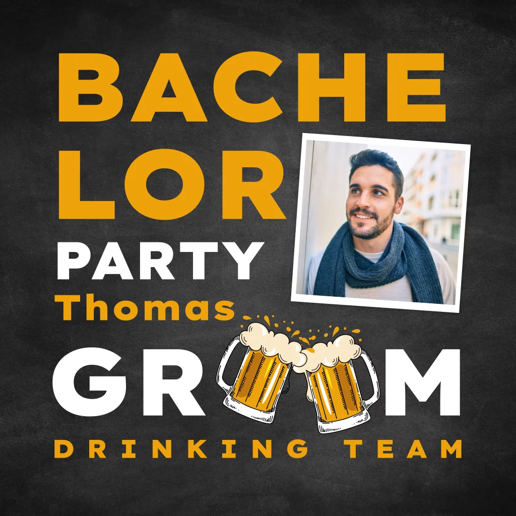 Uitnodiging voor een bachelor party voor de groom to be! Deze uitnodigingskaart voor een vrijgezellenfeest van een man is stoer met bier en een eigen foto. Vervang de foto in het polaroid kader voor een foto van de vrijgezelle bachelor. Bestel vandaag nog en maak van het vrijgezellenfeest een onvergetelijke dag met het groom drinking team!