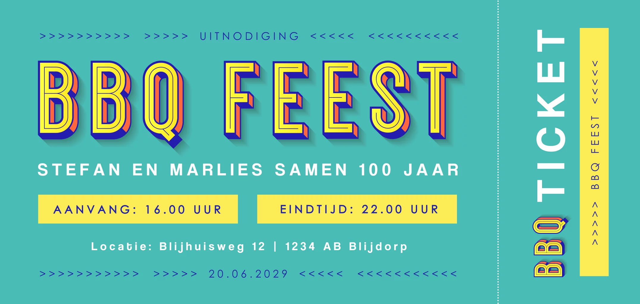Dubbel feest! Nodig jullie vrienden en familie uit met deze feestelijke typografische uitnodiging in ticket stijl. De blauwe en gele kleuren en verschillende lettertypes geven deze uitnodigingskaart een vrolijke retrolook. Wie nodigen jullie uit voor jullie barbecue tuinfeest?