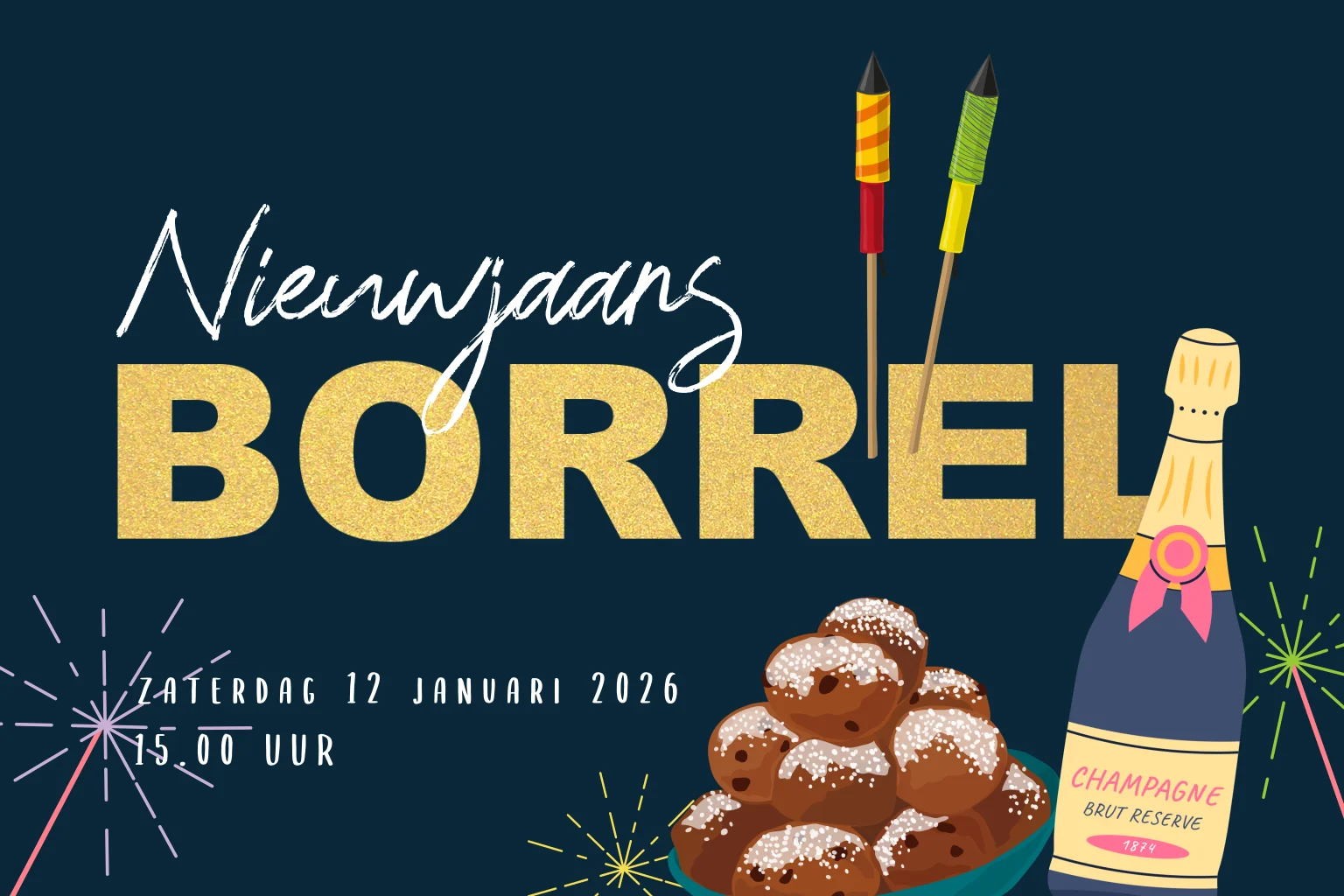 Tijd voor een nieuwjaarsfeestje? Kies dan voor deze feestelijke uitnodiging voor een nieuwjaarsborrel. Op deze uitnodiging een illustratie van oliebollen, champagne en vuurwerk. Een echte klassieker tijdens de feestdagen! Deze uitnodiging heeft een donkerblauwe achtergrond. De tekst 'borrel' in gouden letters maakt de kaart extra feestelijk.