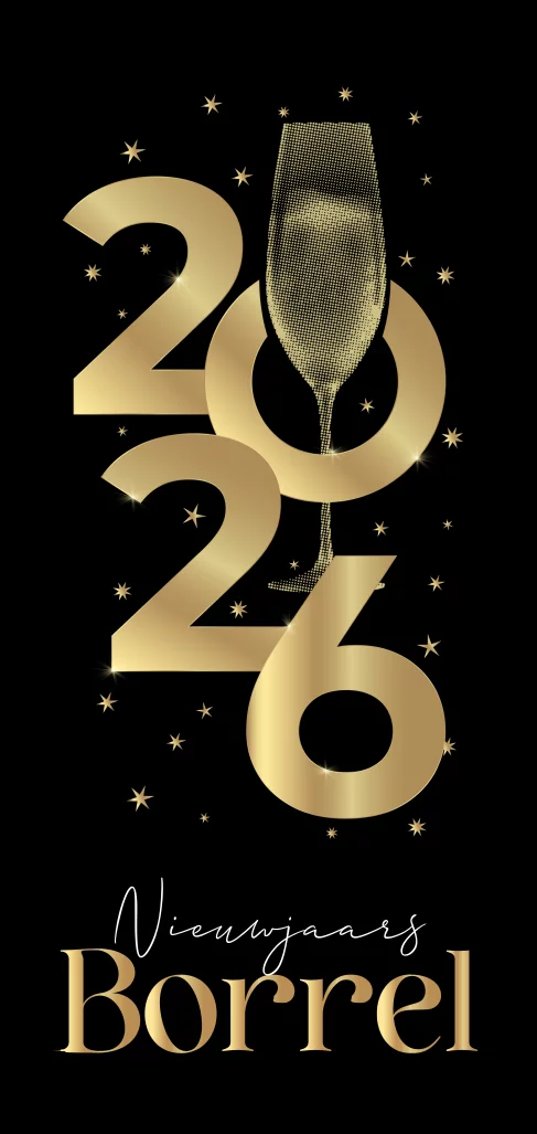 Een nieuwjaarsborrel uitnodiging met een champagneglas als design is de perfecte keuze voor een zakelijke nieuwjaarsborrel. De zwarte achtergrond, de gouden sterretjes en het gouden jaartal 2026 zorgen voor een luxe, sprankelende uitnodiging. De witte envelop met gouden inlay maakt deze kaart helemaal af. Pas deze kaart naar eigen wens aan in onze online editor en maak er een onvergetelijke borrel van.