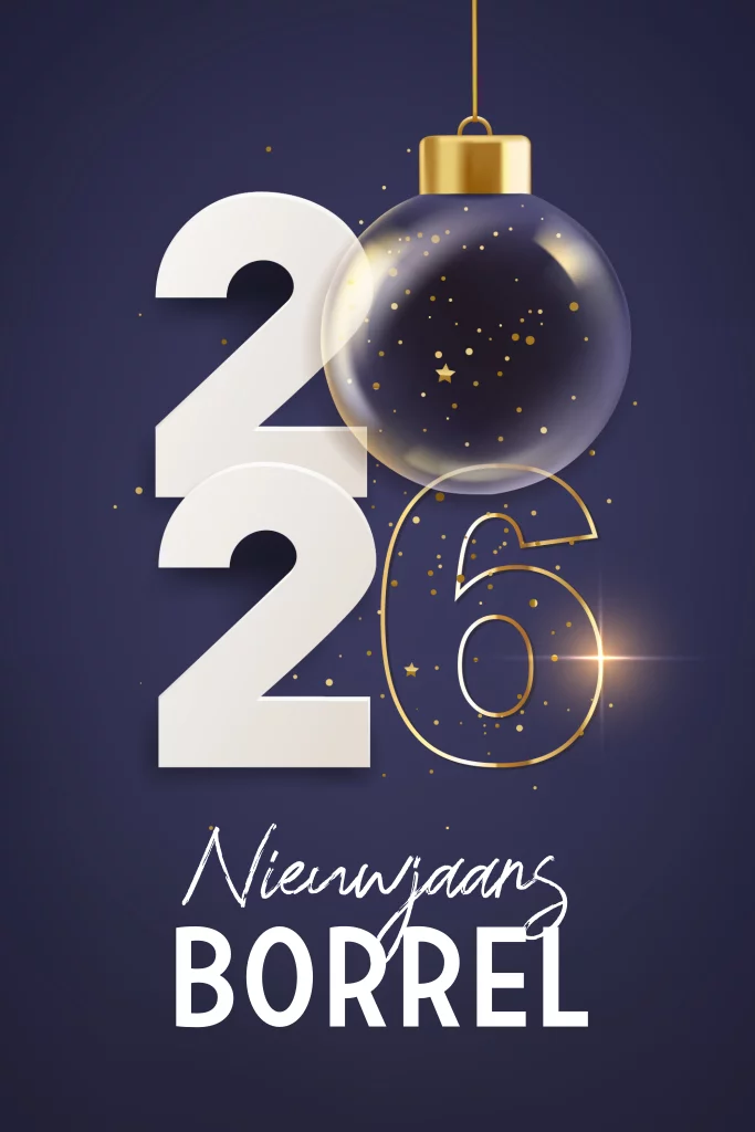 Nodig als je medewerkers en zakelijke relaties uit voor een fantastische nieuwjaarsborrel met deze kaart. Op deze kaart zie je het jaartal 2026 staan waarbij het cijfer nul is vormgegeven in een glazen kerstbal. Met de donkerblauwe achtergrond en de gouden sprankels creëer je een feestelijke sfeer die perfect past bij de feestdagen. Pas deze kaart naar eigen smaak aan en maak er een fantastische borrel van. Proost op het nieuwe jaar!