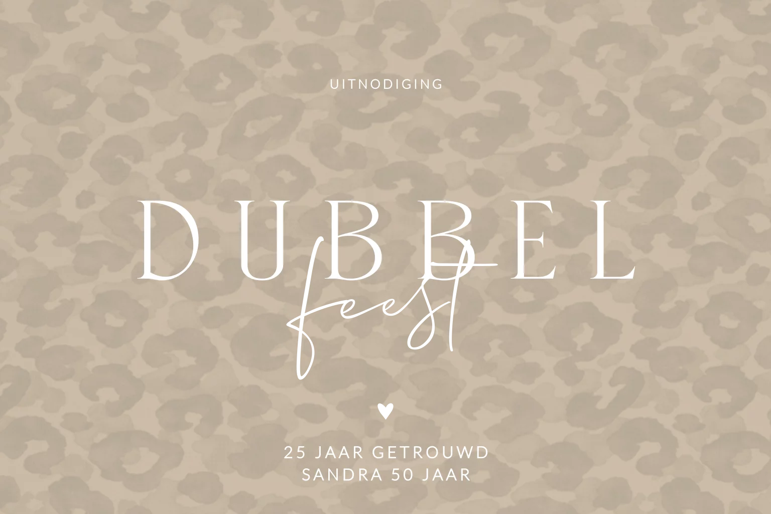 Hippe uitnodiging om een dubbel feest te vieren, jullie 25-jarig huwelijksjubileum en 50ste verjaardag. De uitnodiging heeft een panter print achtergrond. De afgeronde hoeken en goudfolie geven de kaart een luxe uitstraling. Pas deze uitnodiging geheel naar eigen wens aan in de editor. Hulp nodig? Wij helpen je graag! Bel, mail of chat ons gerust en wij helpen je verder.
