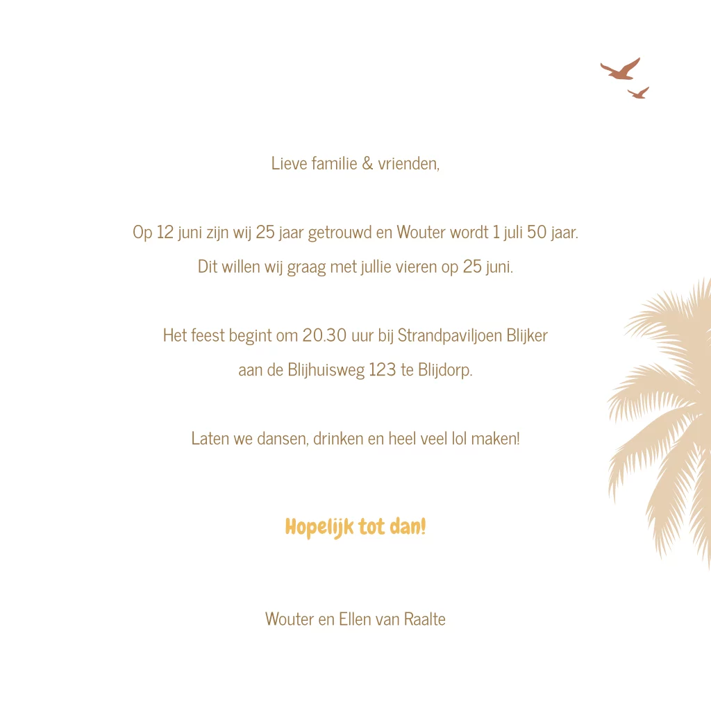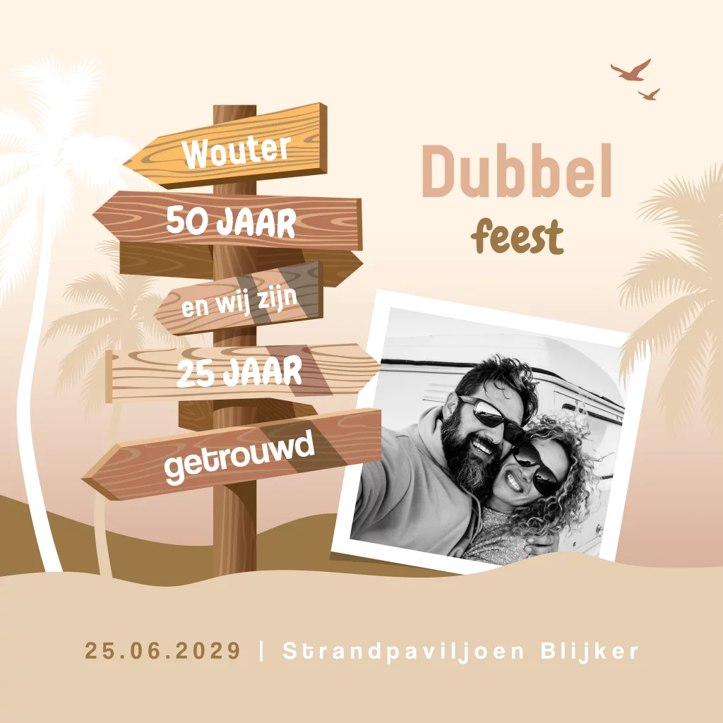 Zomerse uitnodiging voor een dubbel feest. Vier jullie 50ste verjaardag en 25-jarig huwelijksjubileum met deze vrolijke uitnodigingskaart in strand thema. Op deze tropische kaart zie je een houten wegwijzer in het zand met op de achtergrond palmbomen. Voeg een mooie foto toe van jullie zelf en maak van deze kaart je eigen persoonlijke uitnodiging.