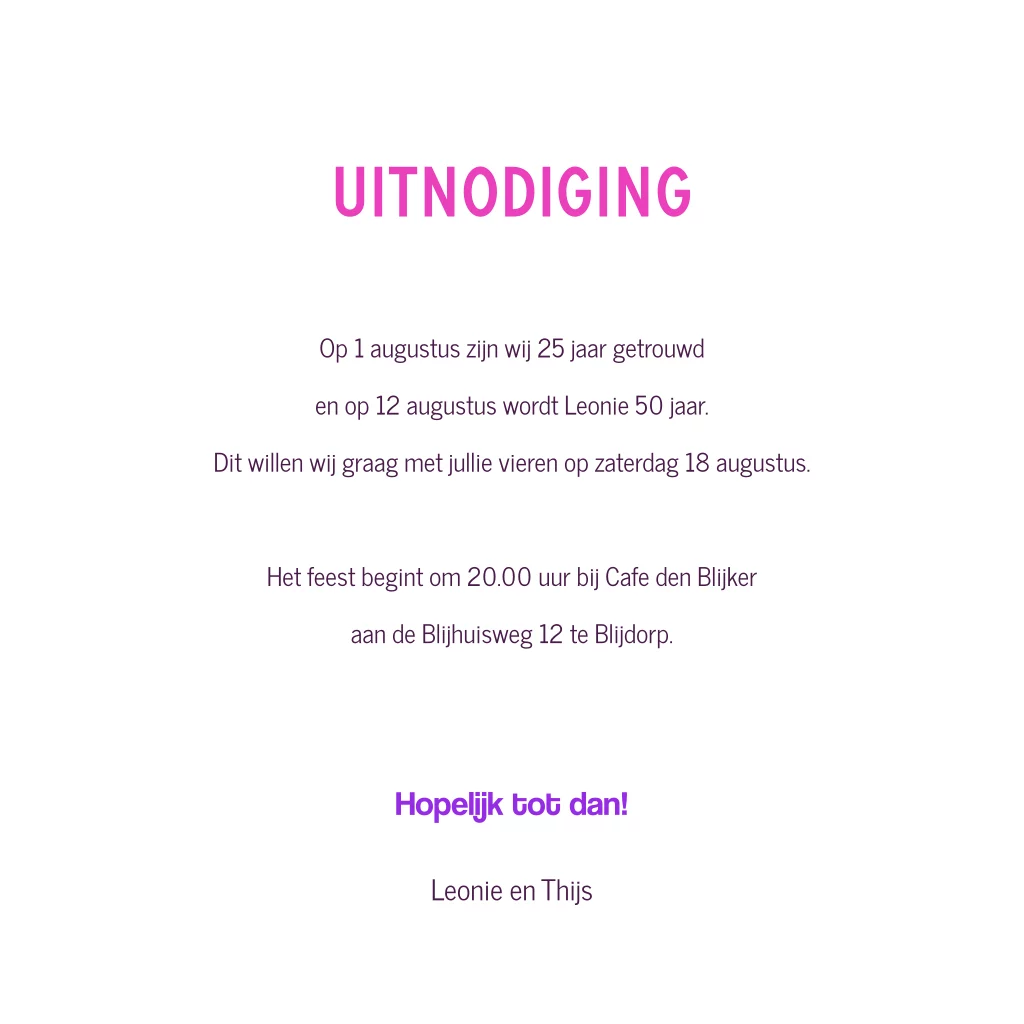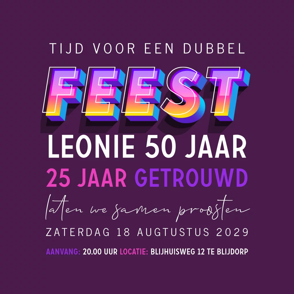 Geef een dubbel feest om te vieren dat jullie 25 jaar getrouwd zijn en één van jullie 50 jaar wordt en dus Sarah of Abraham ziet. Deze uitnodiging heeft retro neon letters en is lekker kleurrijk. Laat deze kleurrijke en typografische uitnodiging jullie feest compleet maken en zorg voor een onvergetelijke viering van deze mijlpalen in stijl!