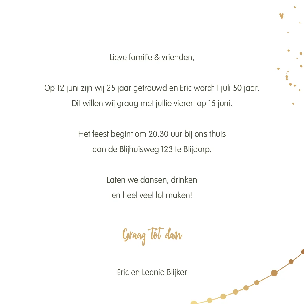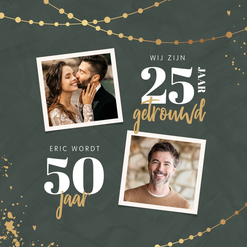 Moderne uitnodiging voor een 25-jarig huwelijksjubileum en 50ste verjaardag. De gouden slingers en spetters maken de kaart extra feestelijk. Deze kaart is ook aan te passen naar een andere bruiloftsjaren of leeftijden, bijvoorbeeld om te vieren dat je 25 jaar samen bent. De teksten en getallen pas je gemakkelijk aan in de editor.