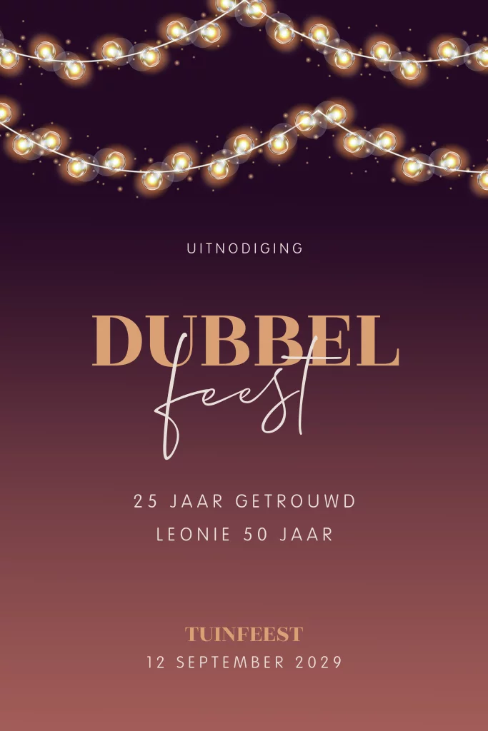 Zijn jullie 25 jaar getrouwd en wordt iemand 50 jaar? Vier deze mijlpalen met het geven van een dubbel feest! Daar past deze hippe uitnodiging perfect bij. Deze uitnodiging voor een verjaardag en huwelijksjubileum heeft een mooi rood roze kleurverloop met een lampenslinger. Zo geef je perfect aan dat jullie een tuinfeest geven. De rood roze kleur met kleurverloop lijkt op de lucht in de zomer avonden. Extra leuk aan deze kaart is dat je de kleur kunt aanpassen naar elke gewenste kleur. Zo creëer je steeds een andere stijl. De kaart pas je gemakkelijk aan in de editor. De ronde hoeken maken de kaart helemaal af.