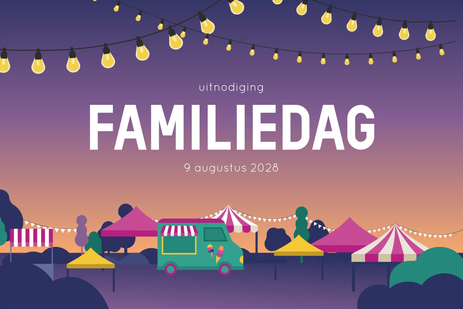 Op zoek naar een familiedag uitnodiging? Kies dan voor deze toffe festival uitnodiging. Op deze kaart zie je festivaltenten met lampjes en een ijscokar. Een leuk thema voor een fantastische familiedag! Pas deze kaart naar eigen wens aan in de online editor.