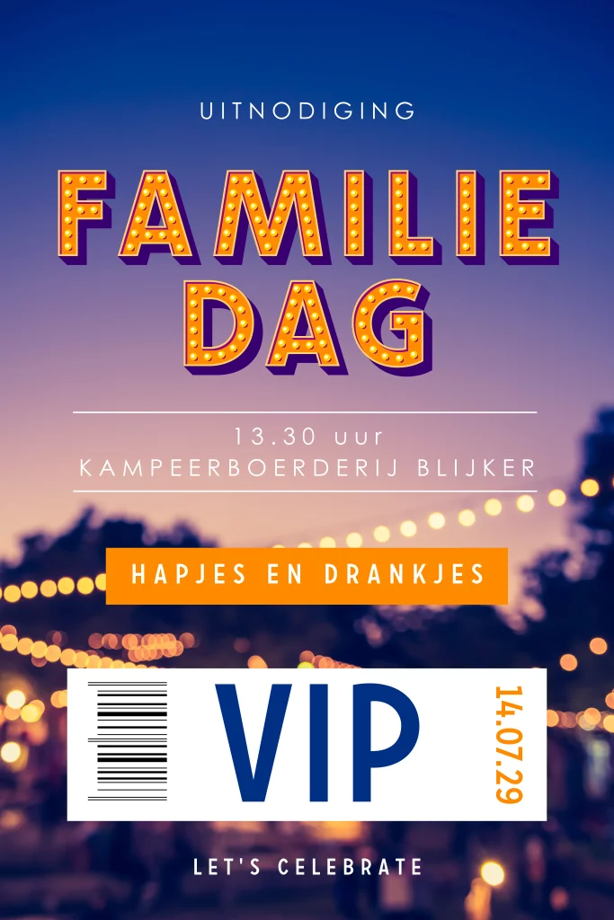 Festival ticket uitnodiging voor een gezellige familiedag met hapjes en drankjes. Deze uitnodiging kun je als VIP ticket gebruiken. Op de achtergrond staat een sfeerfoto van een festival met lampjes. Alle teksten en kleuren zijn eenvoudig aan te passen in onze editor.