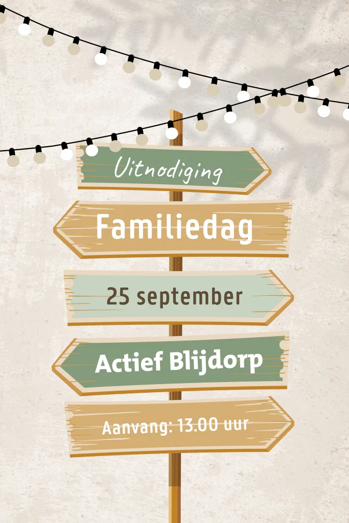 Deze uitnodiging is perfect voor een familiedag. Nodig met deze uitnodigingskaart als je familie uit voor een gezellige familiedag. Op de kaart staat een houten wegwijzer met informatie en een lampenslinger. De ronde hoeken maken de kaart helemaal af. Pas de teksten eenvoudig aan in de editor.