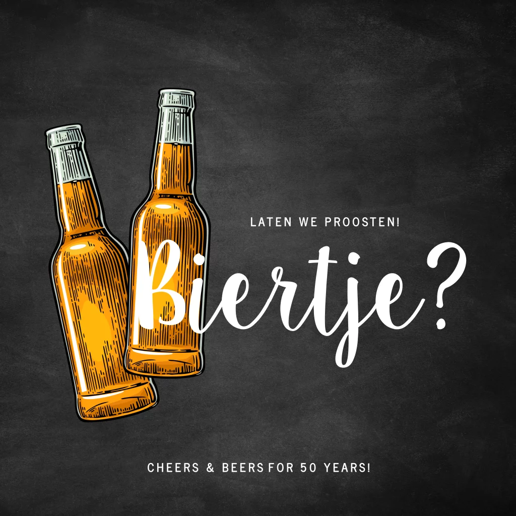 uitnodigingskaart om samen een biertje te drinken met de tekst: laten we proosten. De achtergrond van de kaart is krijtbord wat een stoer effect heeft. Ook de tekst cheers & beers staat op de kaart. Deze kaart kun je gebruiken voor een verjaardag, tuinfeest, examenfeest etc.