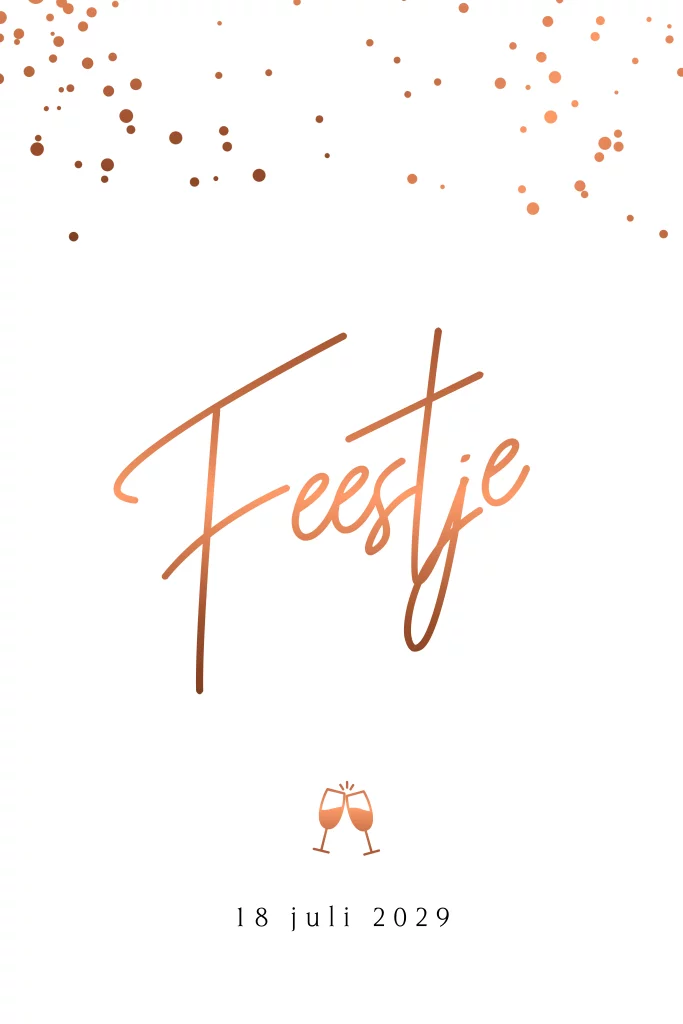 Hippe uitnodigingskaart voor een feestje. Op deze kaart die zowel voor vele gelegenheden geschikt is, zijn het woord feestje en de proostende glazen in een mooi koperverloop afbeelding. Hierdoor krijgt deze uitnodiging een stijlvolle uitstraling.