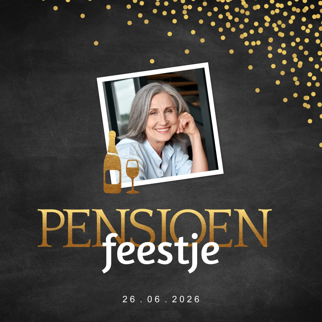 Pensioen uitnodiging met champagne, gouden stippen en foto