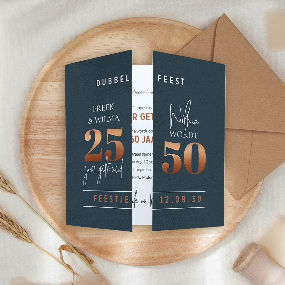 Dubbel feest luikvouw uitnodigingskaart voor een verjaardag en huwelijksjubileum. Dit theatervouw kaartje heeft een mooie combinatie van een donkerblauwe achtergrond met wit en koperkleur. Verder is de kaart opgemaakt met verschillende lettertypes, een champagnefles en proostende glazen. Natuurlijk is het mogelijk om 25 jaar getrouwd of 50 jaar aan te passen naar andere getallen.