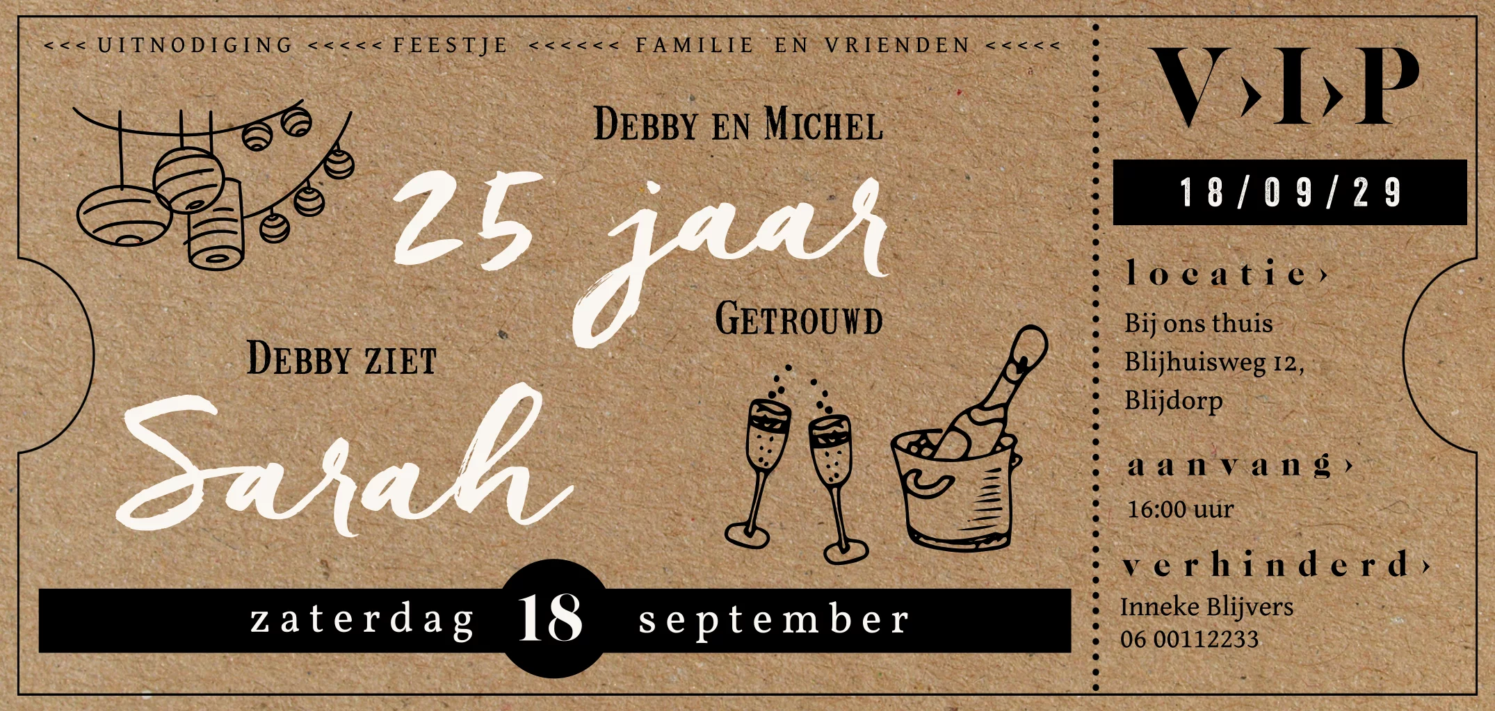 Sarah of Abraham gezien en een 25-jarig huwelijksjubileum te vieren? Nodig jullie vrienden en familie uit met deze hippe typografische uitnodiging in ticket stijl. Op deze feestelijke kartonlook kaart staat een slinger van lampionnen met champagne. Pas de tekst gemakkelijk aan in de editor. Wie nodigen jullie als VIP uit voor jullie dubbel feest?