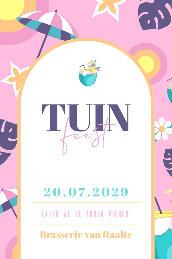 Nodig al je gasten uit met deze kleurrijke uitnodiging vol met parasolletjes en bladeren. Perfect voor een zomers tuinfeest! De speelse boogvorm bestaat uit tekst een een cocktail.