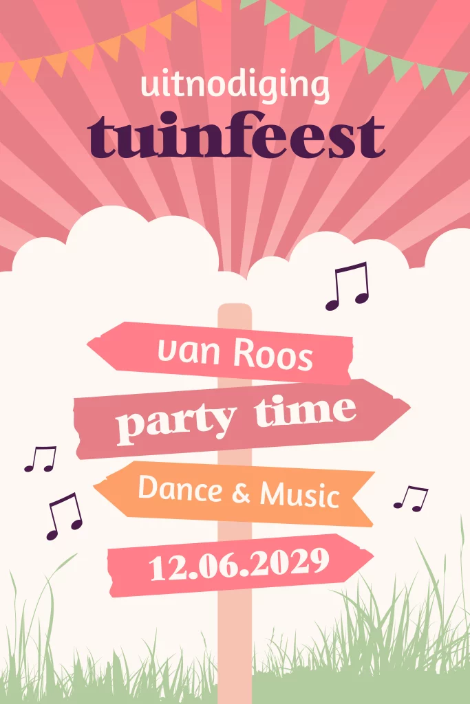 Deze uitnodigingskaart heeft een roze gestreepte achtergrond met wolken, slingers en gras. De wegwijzer voorziet de ontvanger van informatie over het feestje. Pas de kleuren en lettertypes gemakkelijk aan in onze editor.