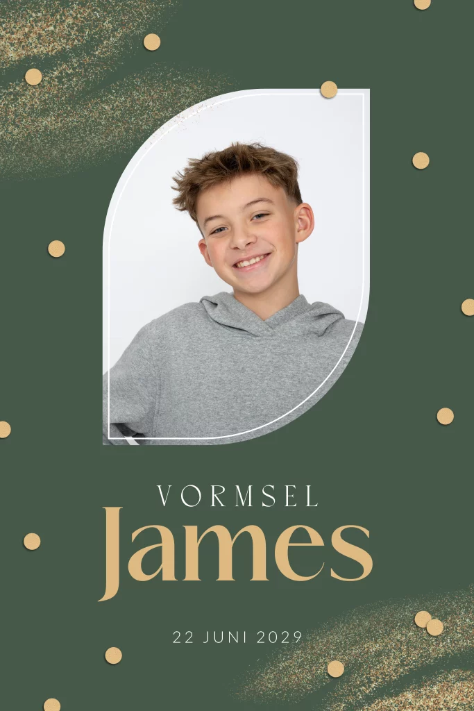 Eenvoudige, maar hippe uitnodiging voor een vormsel. Deze kaart heeft een donkergroene achtergrond, goudkleurige confetti en er is ruimte voor een foto van jouw kind. Deze vormsel uitnodiging is afgewerkt met ronde hoeken.