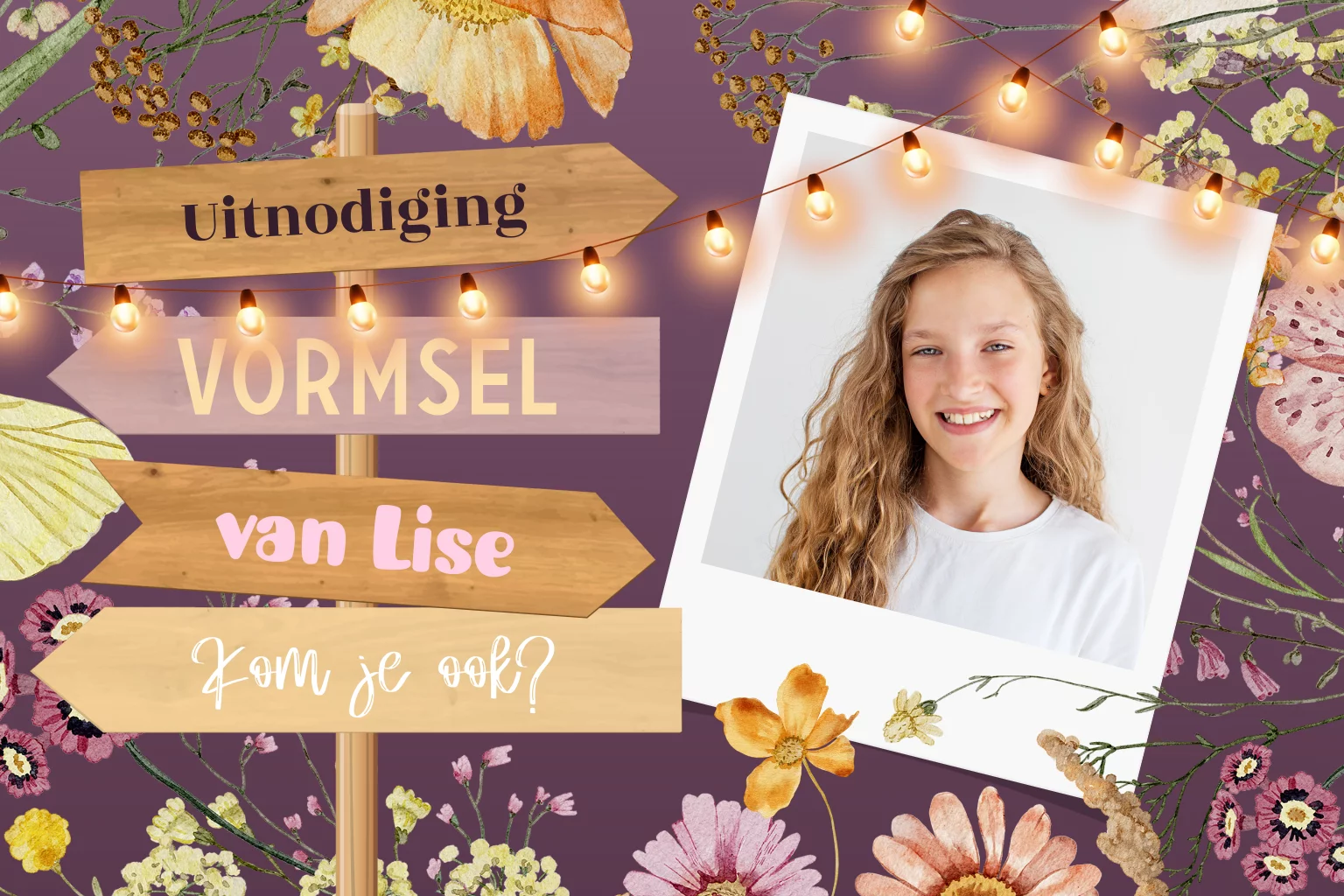 Feestelijke uitnodiging voor een vormsel met eigen foto. Op deze kaart staat een wegwijzer met tekst die eenvoudig zelf aan te passen is in onze online editor. De bloemenachtergrond, lampjes en de ronde hoeken zorgen voor een extra feestelijke uitnodiging. Nodig al je gasten uit met deze uitnodiging uit en maak er een prachtig feestje van.