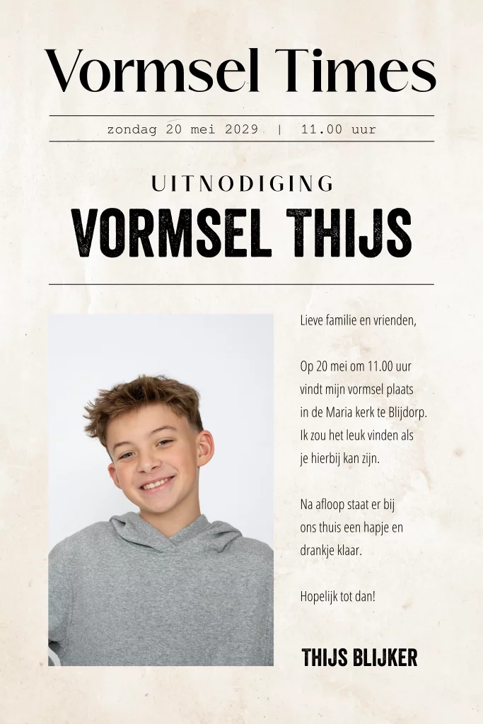 Een stoere uitnodiging om je vormsel mee aan te kondigen. Deze uitnodiging voor een jongen lijkt op een krant: de Vormsel Times. Voeg een foto van de vormeling toe voor de persoonlijke touch. Pas kleuren en lettertypes naar eigen wens aan in de online editor. Met de kraft envelopkleur maak je deze vormsel uitnodiging helemaal in stijl af.