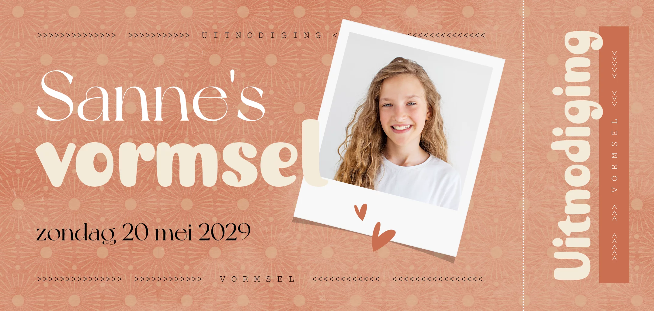 Een hippe uitnodiging vormsel in ticketvorm. De achtergrond heeft een aquarel look en patroon van zonnetjes. Er is ruimte voor een eigen foto in het kader. Pas deze uitnodiging helemaal naar eigen wensen aan in de online editor.