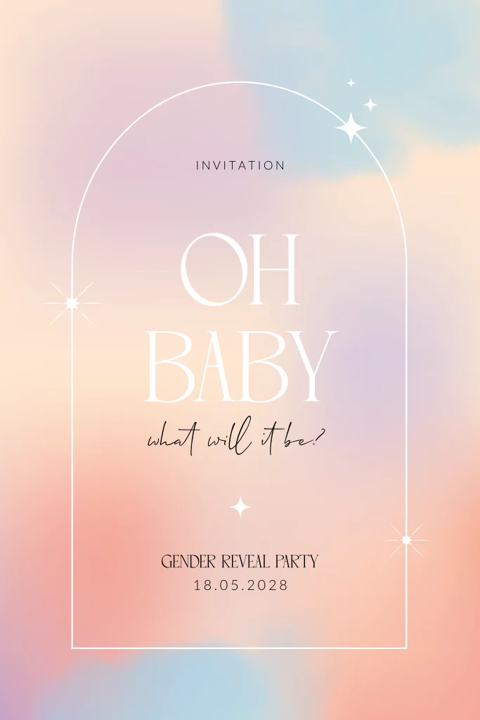 Oh baby what will it be? Wat een sprankelende trendy uitnodiging voor een gender reveal! De roze en blauwe pastel kleuren en het arch kader met sterren maken deze uitnodiging tot een opvallende aankondiging van deze speciale gebeurtenis. Laat vrienden en vrienden met deze gender reveal uitnodiging weten of jullie een jongen of meisje verwachten.