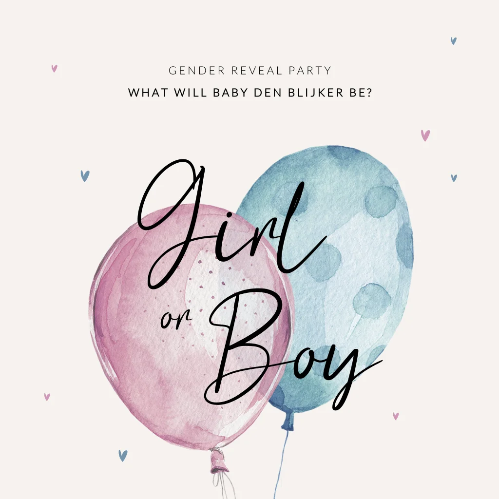 Deze uitnodiging is de perfecte keuze voor een unieke en trendy uitnodiging voor jullie gender reveal party. Vier samen met familie en vrienden de bekendmaking van het geslacht van jullie baby. Is het een jongen of een meisje? Op deze uitnodiging zie je twee aquarel ballonnen in de kleur roze en blauw. De uitnodiging heeft een beige achtergrond en bevat de tekst 'What will baby .... be? Girl or boy?'.