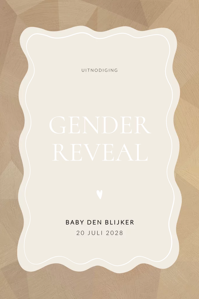 Gender reveal uitnodiging om het geslacht van je baby bekend te maken en te vieren, samen met vrienden en familie. De stijlvolle en moderne uitstraling, gecreëerd door het gebruik van foliedruk en het geometrische patroon in goudlook, maakt deze uitnodiging perfect voor stellen die een rustige en elegante uitnodiging willen voor hun gender reveal party.