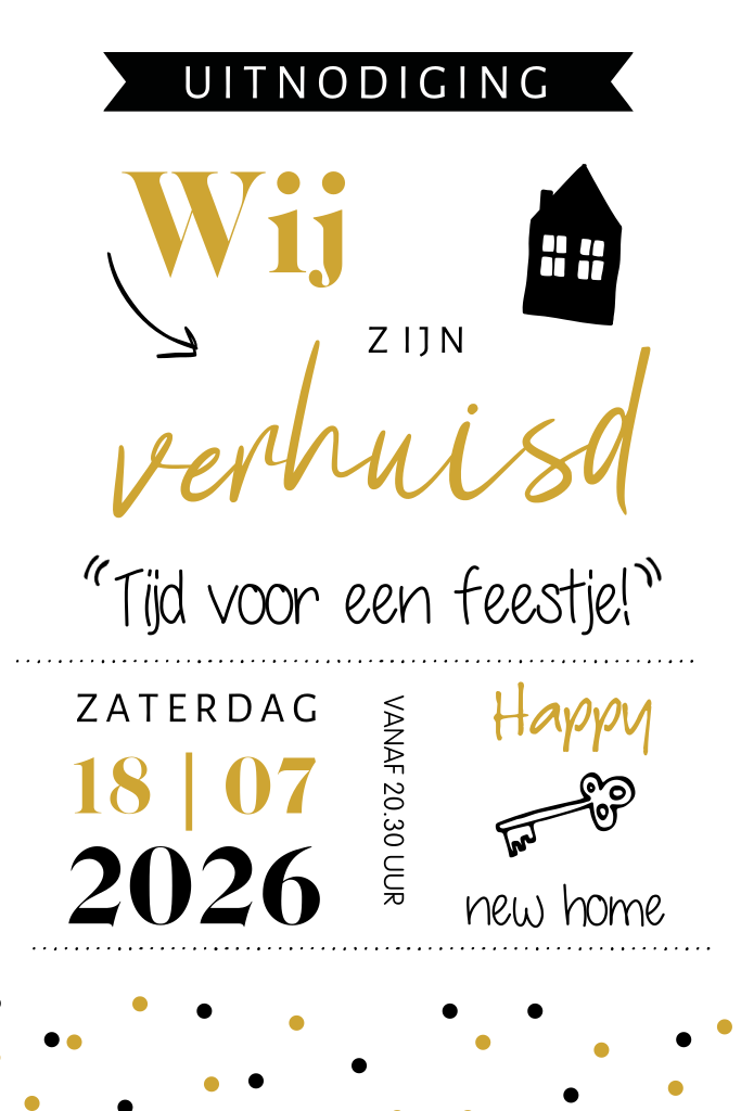 Hippe verhuiskaart en uitnodigingskaart voor een housewarming. Op deze verhuiskaart die ook voor een feestje geschikt is, zie je verschillende getekende illustraties, waaronder een huisje, een sleutel en stippen. Deze typografische stijl is helemaal hip.