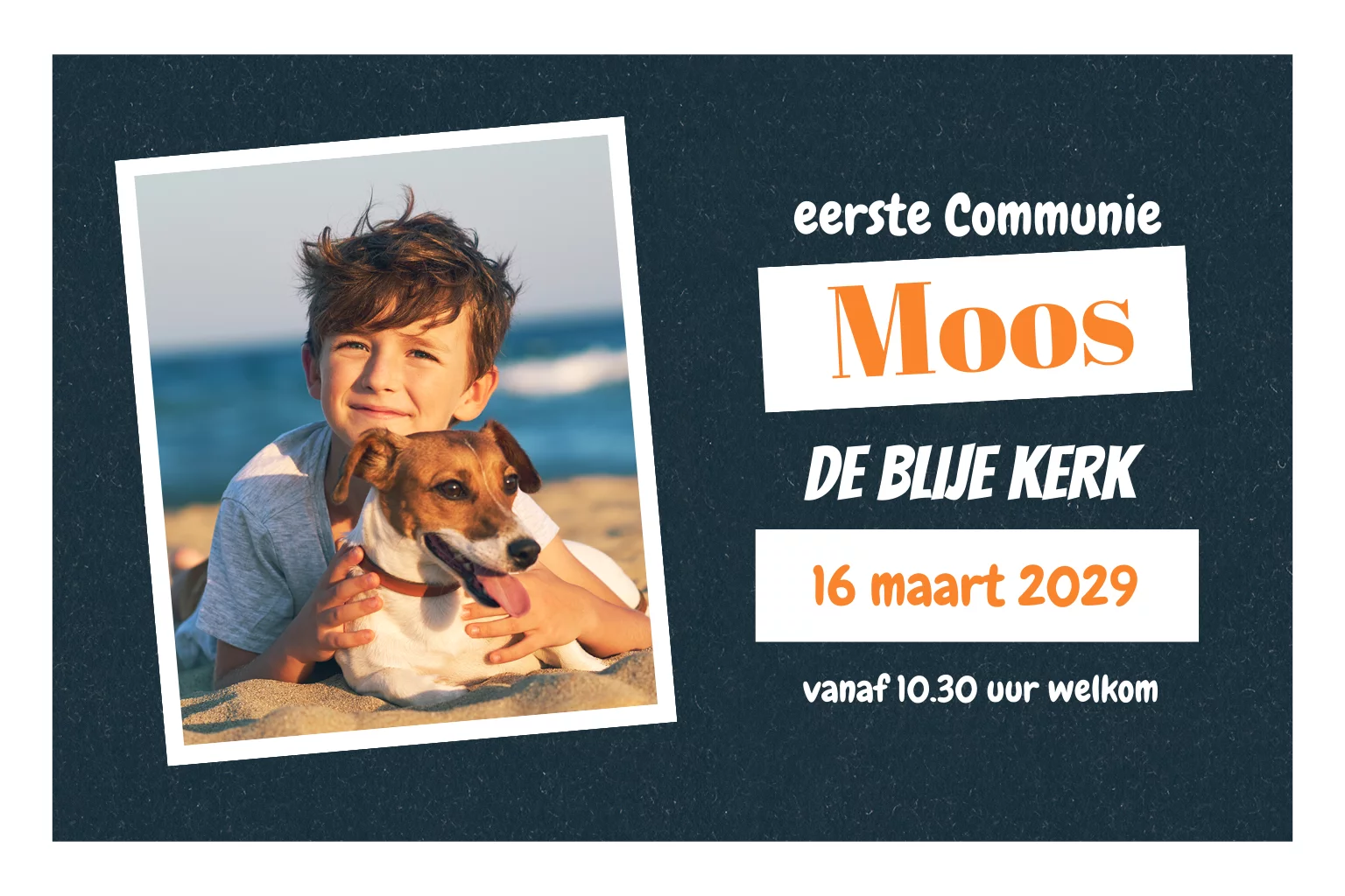 Stoere uitnodiging voor eerste communie feestje. Op deze kaart is ruimte voor een eigen foto die je makkelijk kunt toevoegen via onze online editor. De achtergrondkleur heeft een donkerblauwe kleur en de uitnodiging heeft een wit kader.