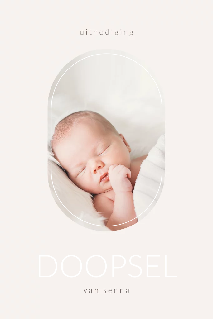 Chique uitnodiging voor het doopsel van je kleintje. Op deze uitnodiging is ruimte voor een eigen foto, deze staat in een ovale vorm op het kaartje, over de foto loopt een randje van goudfolie. Ook de letters worden gedrukt in goudfolie. Hulp nodig bij het ontwerpen? Stuur ons gerust een mailtje of bel/chat met ons.